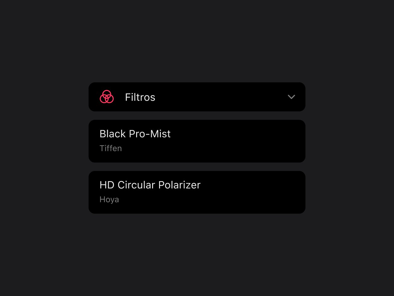 Los filtros ahora son parte de tu flujo de trabajo de registro de película. Registra qué filtros usaste para cada fotograma, incluyendo UV, ND, CPL y más. Esto completa tu documentación analógica capturando cada elemento que afecta tu imagen final, desde el cuerpo de la cámara y objetivo hasta la película y filtros. Los datos de filtro se incluyen en todas las exportaciones y se sincronizan con la aplicación Mac para un registro completo.