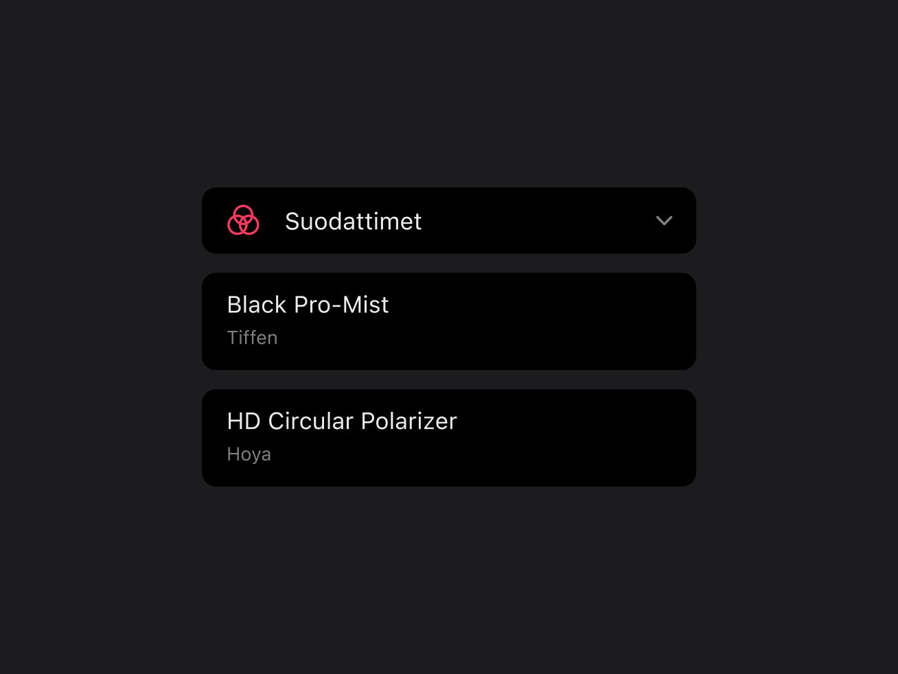 Suotimet ovat nyt osa filmikirjaustyönkulkuasi. Tallenna, mitä suotimia käytit jokaiselle kuvalle, mukaan lukien UV, ND, CPL ja muut. Tämä täydentää analogisen dokumentoinnin sieppaamalla jokaisen elementin, joka vaikuttaa lopulliseen kuvaasi kamerarungosta ja objektiivista filmilaatoon ja suotimiin. Suodintiedot sisältyvät kaikkiin vienteihin ja synkronoituvat Mac-sovelluksen kanssa kattavaa tallentamista varten.