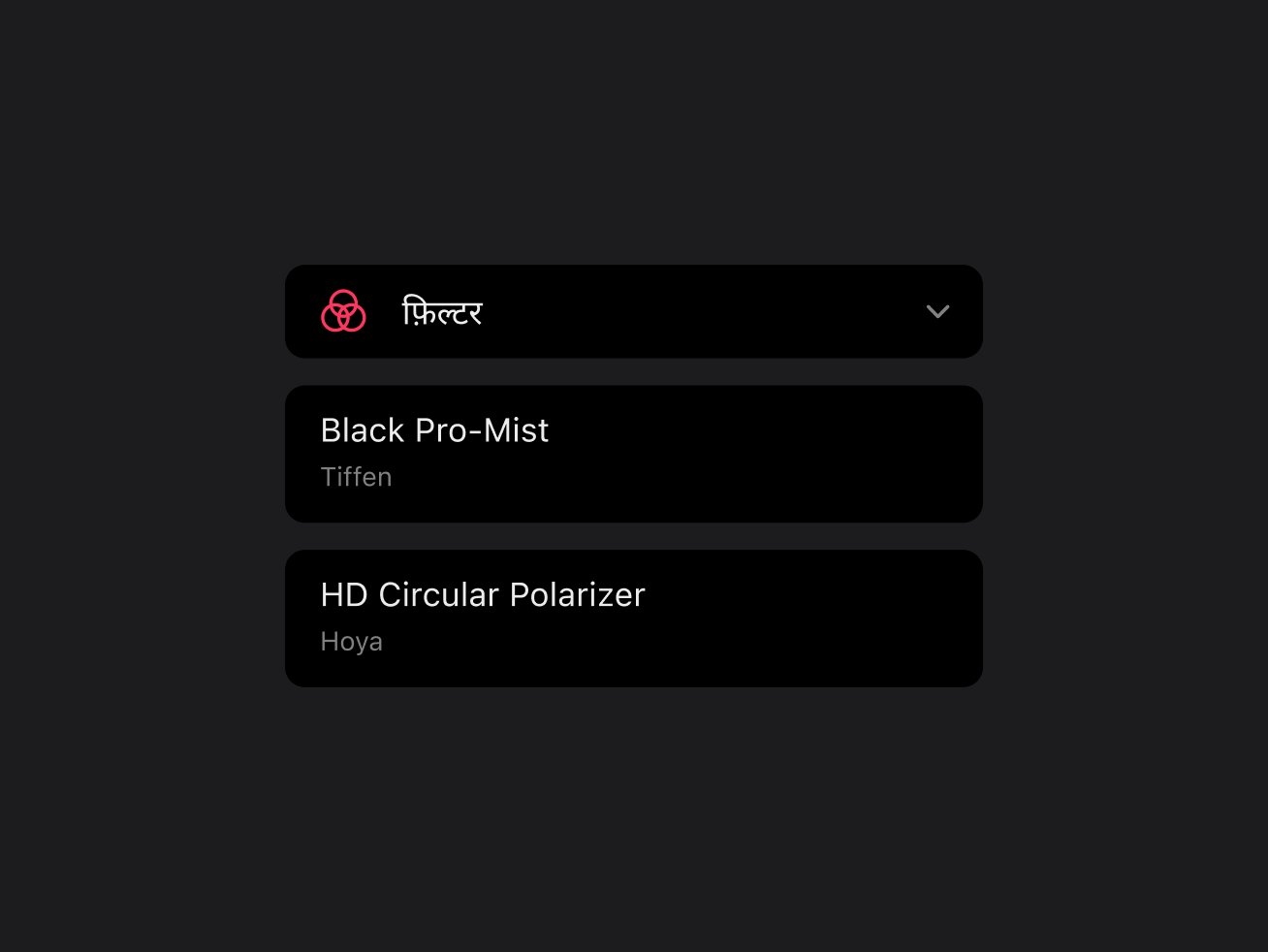 फ़िल्टर अब आपके फ़िल्म लॉगिंग workflow का हिस्सा हैं। प्रत्येक फ़्रेम के लिए आपने कौन से फ़िल्टर उपयोग किए, यह रिकॉर्ड करें, जिसमें UV, ND, CPL और अधिक शामिल हैं। यह आपकी अंतिम छवि को प्रभावित करने वाले हर तत्व को कैप्चर करके आपके एनालॉग दस्तावेज़ीकरण को पूरा करता है, camera body और lens से लेकर film stock और फ़िल्टर तक। फ़िल्टर डेटा सभी exports में शामिल है और व्यापक रिकॉर्ड-रखने के लिए Mac ऐप के साथ sync होता है।