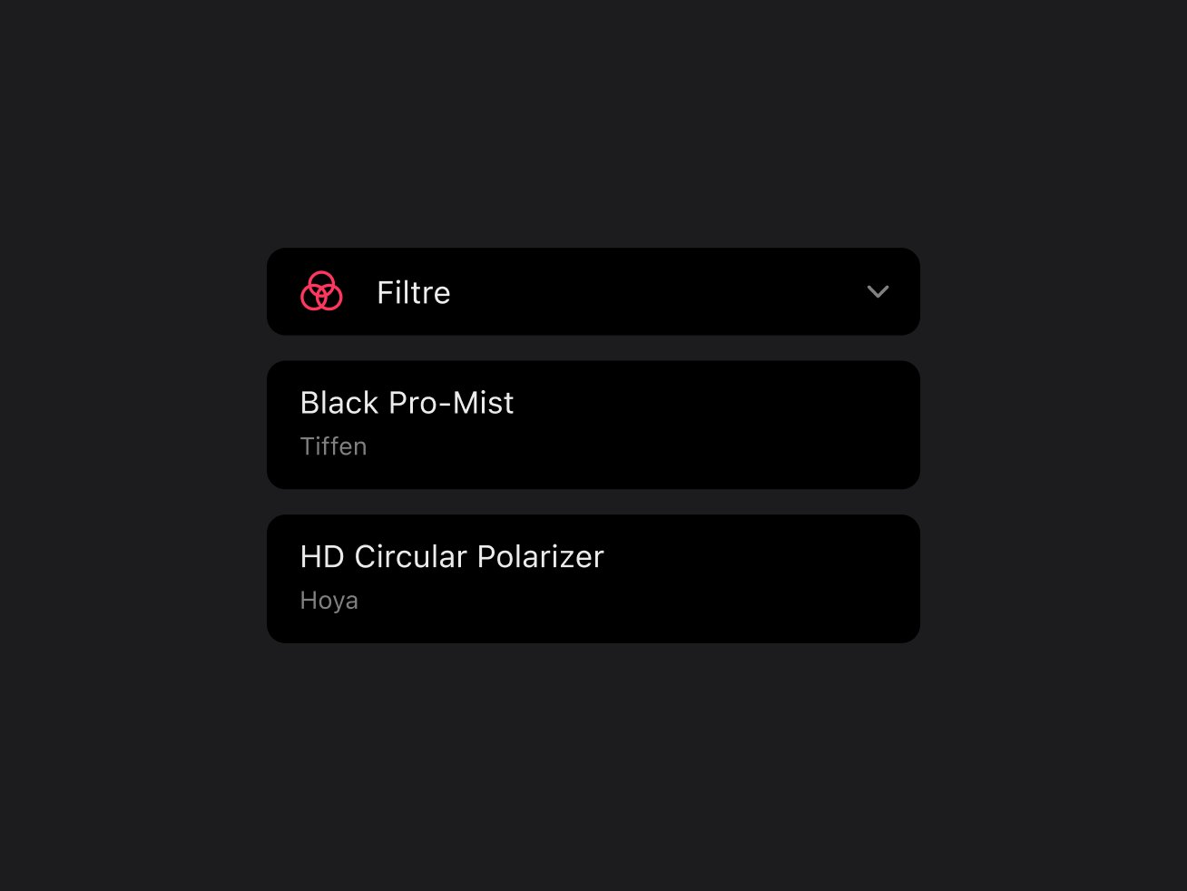 Dokumenter din komplette analoge arbeidsflyt ved å logge filtre sammen med kamera, objektiv og film. Nå kan du registrere UV-, ND-, CPL- og andre filtre brukt for hvert bilde.