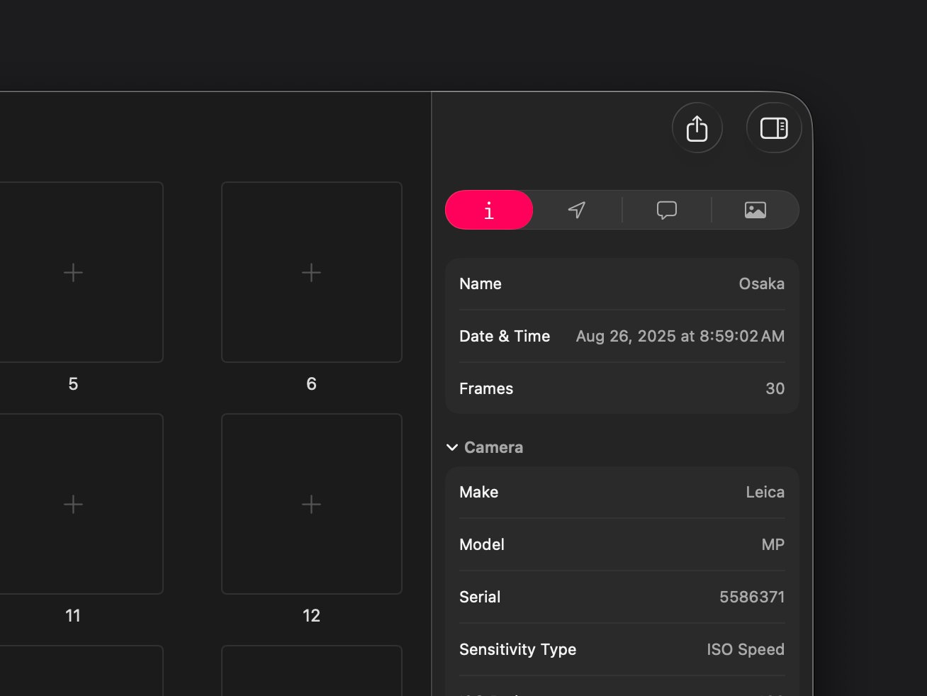 Боковая панель теперь интеллектуально запоминает, какие разделы вы предпочитаете развёрнутыми или свёрнутыми — будь то камеры, объективы, фильтры, типы плёнок, GPS-координаты, карта или предварительный просмотр изображения. Ваше рабочее пространство остаётся организованным именно так, как вам нравится, экономя время и снижая трения в ежедневном рабочем процессе.